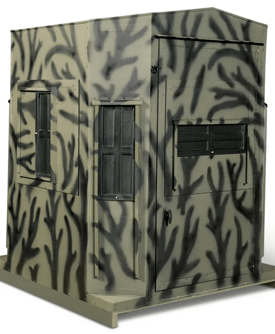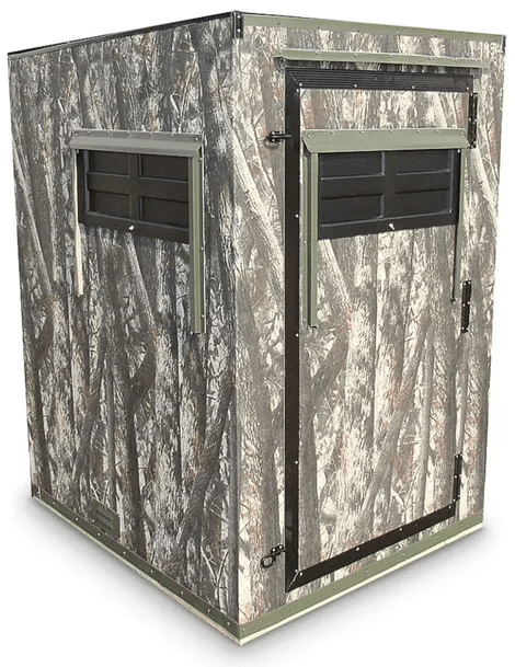 ~ High-performance hunting blind ~ Aluminum exterior for long-lasting durability ~ Shooting windows open and close soundlessly ~ Peaked roof for extra interior room ~ Fully insulated structurally engineered walls ~